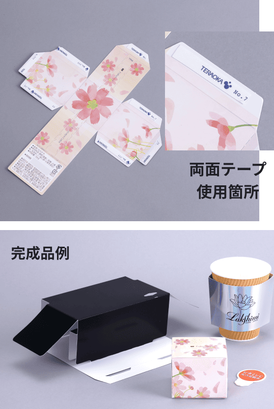 組箱や折り箱は、パーツも多くほとんどが手作業によって作成されます。その際に多くの両面テープが使用されます。