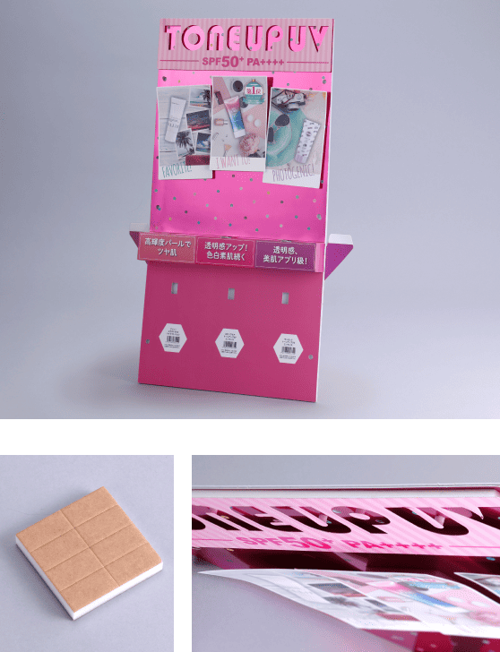 紙製什器の協調したい箇所などに厚みのある白発砲ポリなどを使用して協調したい部分を浮かしたりします。